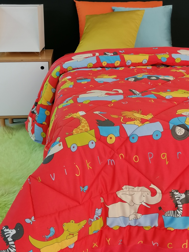 Ένα μονό πάπλωμα με ύφασμα βαμβακοσατέν σε υπέροχα φλούο χρώματα και παραστάσεις από πολύχρωμα ζωάκια σε φόντο κόκκινο!Φροντίστε το δωμάτιο του παιδιού σας μα ένα πάπλωμα παιδικό Cotton Tales!