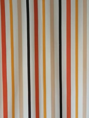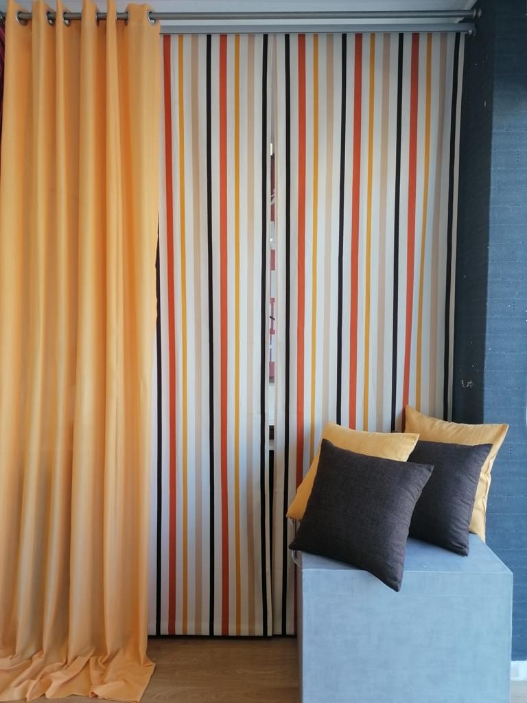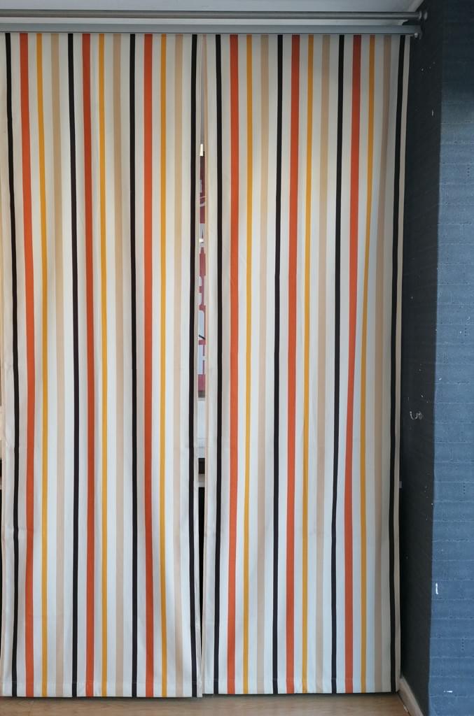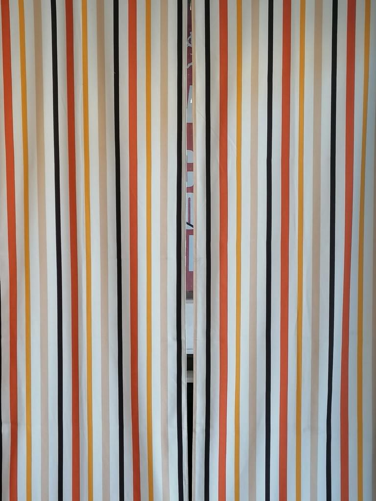 Πανό τεντωμένο, βαμβακερό, επενδυμένο με ύφασμα blackout στην πίσω μεριά με ρίγες πορτοκαλί, μπεζ, καφέ και τρέσα ραμμένη που μπορεί να κρεμαστεί σε οποιοδήποτε σιδηρόδρομο ή κουρτινόξυλο. Μπορείτε επίσης να την κρεμάσετε σαν ριντό με μία εσωτερική διάφανη κουρτίνα σε ανοιχτές αποχρώσεις. Μία διαφορετική πρόταση κουρτίνας σκίασης για ένα πιο minimal αποτέλεσμα.